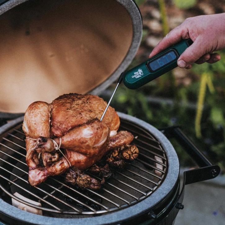 Termometr cyfrowy przeznaczony jest do szybkiego odczytu temperatury wewnątrz grillowanych mięs, drobiu czy ryb. Pozwala łatwo i bezpiecznie upewnić się że dania pieką się prawidłowo w odpowiedniej temperaturze. Wystarczy umieścić czujnik wykonany ze stali nierdzewnej we wnętrzu produktu by odczytać temperaturę na dużym wyświetlaczu LCD w ciągu zaledwie 3-4 sekund. Wyświetlacz termometru jest obracalny by ułatwiać odczyt temperatury w każdym położeniu. Zakres temp. do 232°C. Dodatkowe wyposażenie to zamykane etui z logiem Big Green Egg