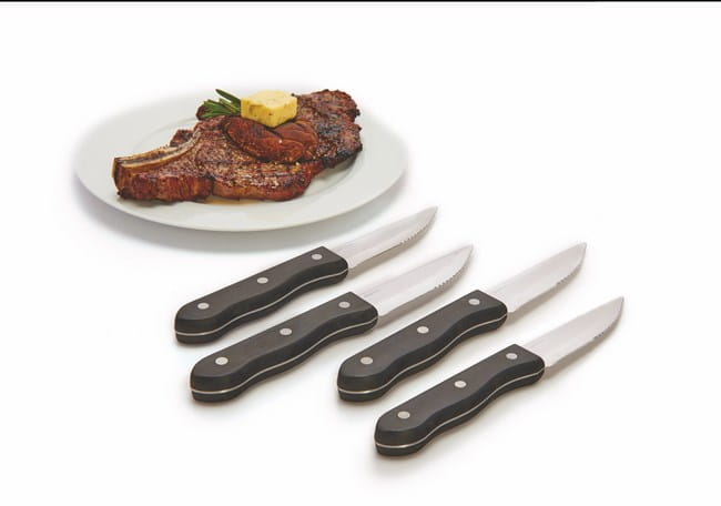 Noże do steków  Broil King, to zestaw czterech ostrych  noży z ząbkowanymi ostrzami, które z łatwością pokroją każdego steka przygotowanego na grillu. Ostrza  noży zostały wykonane ze stali szlachetnej co  zapewnia wysoką  ich trwałość, a bakelitowe ergonomiczne  trzonki  przystosowane do dłoni  ułatwiają proces krojenia.