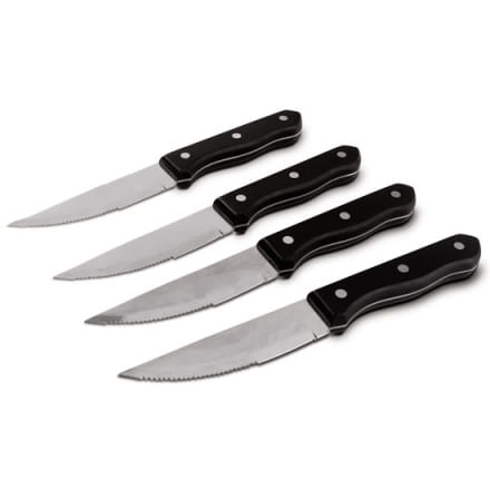 Cztery noże do krojenia steków przygotowanych na grillu.