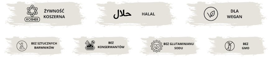 - Nie zawiera konserwantów, GMO, sztucznych barwników oraz glutaminianu sodu.