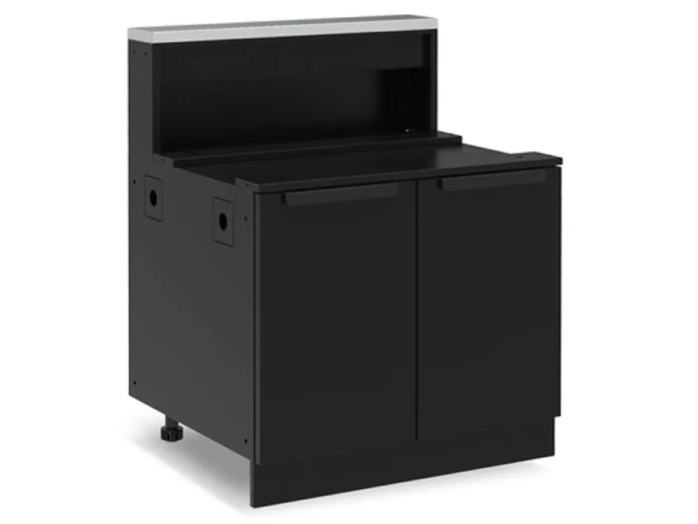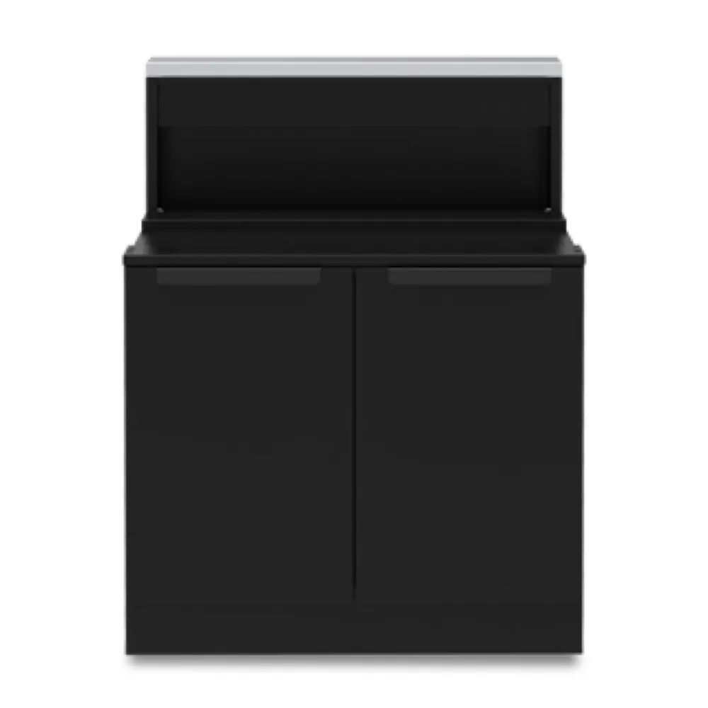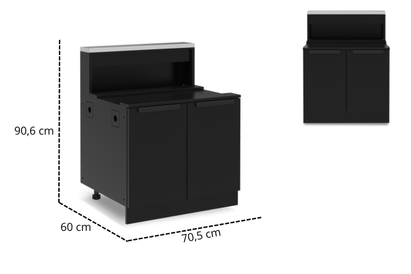 Duże i przestronne wnętrze umożliwia przechowywanie akcesoriów, naczyń i przypraw, dzięki czemu wszystko, wszystko co potrzebne podczas grillowania, zawsze znajduje się w zasięgu ręki. Z przodu szafka posiada podwójne drzwi z systemem cichego domyku i wygodnymi uchwytami. Wszystkie zewnętrzne elementy zostały pokryte czarną farbą proszkową, co skutecznie chroni je przed korozją. Stabilność konstrukcji zapewniają cztery regulowane nóżki, dla łatwego poziomowania grilla. Całość zamykają maskujące dolne cokoły dookoła szafki sprawiając, że prezentuje się ona estetycznie i spójnie. Blat szafki wykonany ze stali szlachetnej co gwarantuje trwałość i odporność na warunki atmosferyczne.