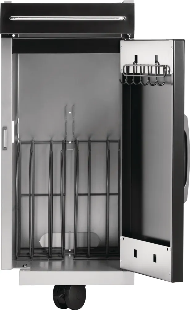 Solidna konstrukcja szafki i nowoczesny stalowy design doskonale komponuje się z grillem. Szafka jest mocowane do bocznej ściany korpusu grilla pod pólkami bocznymi co zapewnia stabilną wygodę użytkowania. Zestaw zawiera pojedynczą dwustronną szafkę wyposażoną w praktyczną szufladę oraz górny blat roboczy. Wnętrze szafki wypełnia organizer oraz uchwyt na akcesoria. Szafka zmieści wszystkie niezbędne przybory do grillowania i zapewni porządek podczas grillowania.