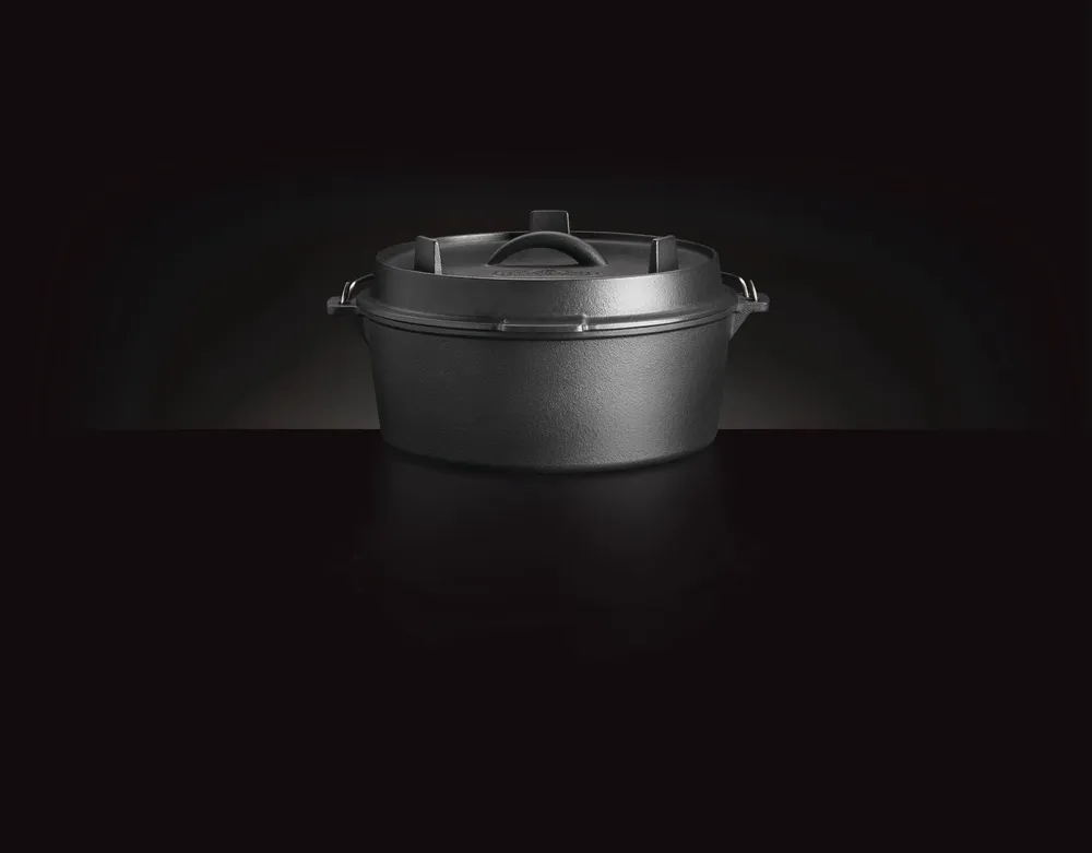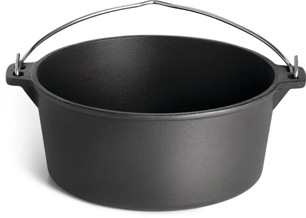 Żeliwny kociołek holenderski to bardzo przydatne akcesorium podczas grillowania w grillach, ale również do wykorzystania np.w ognisku. Ten ma średnicę 25 cm i niebagatelną pojemność wynoszącą 4,5 Litra. Składa się z dwóch części. Dużego żeliwnego garnka z pałąkiem dzięki, któremu możemy go wyjmować z grilla lub ogniska. Pałąk możemy również wykorzystać do powieszenia kociołka nad ogniskiem. Drugą jego częścią jest pokrywa z uchwytem i trzema nóżkami. Uchwyt służy do otwierania i zamykania kociołka. Pokrywę możemy również ustawić w grillu na nóżkach i wtedy służy jako żeliwna brytfanna. Pokrywa ma karbowane dno co zapobiega przywieraniu potraw. Żeliwny kociołek najlepiej i najbezpieczniej obsługiwać przy pomocy silikonowych lub skórzanych rękawic firmy Napoleon.