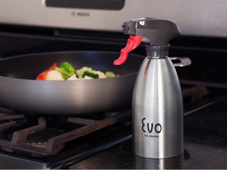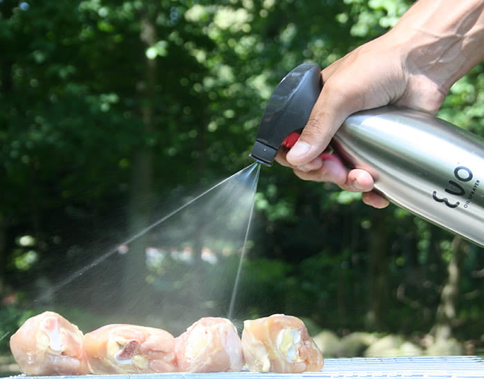 Żeliwne ruszty grilli,  przed grillowaniem należy zwilżyć  jadalnym olejem. Zapobiegnie to przywieraniu grillowanych potraw do rusztów grilla. Możemy to wykonać silikonowym pędzelkiem lub użyć rozpylacz  oleju. Napełniamy pojemnik dowolnym olejem jadalnym, dociskając dużą czerwoną dźwignią  dostarczamy do niego powietrze powodując zasysanie oleju którym rozpylamy ruszty grilla. Rozpylacz oleju EVO SS możemy używać również do aromatyzowania potraw przed grillowaniem, stosując wyszukane olejki ziołowe. Rozpylacz oleju EVO SS posiada aluminiowy zbiornik o pojemności 500 ml zakończony wydajną dyszą spryskującą z dźwignią. Nadaje się również do nawilżania grillowanych potraw, sałat i innych dań.