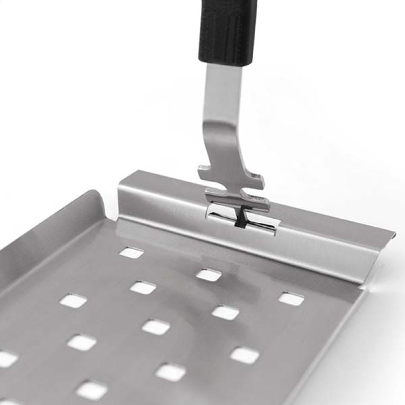 Płytka i wąska brytfanna idealnie nadaje się do grillowania owoców morza, warzyw oraz innych wyrafinowanych potraw, dzięki czemu nie musimy obawiać się, że podczas ich mieszania wypadną one poza jej ściany. Ma perforowany spód zapobiegający przywieraniu potraw oraz zapewnia doskonałe warunki do grillowania, bez obawy o przypalenie. Wykonana jest w wysokiej jakości stali szlachetnej i zaopatrzona jest w dwa 10 mm uchwyty ułatwiające wkładanie i wyjmowanie sylikonowymi rękawicami z piekarnika grilla lub wielofunkcyjnym uchwytem Broil King. Po zakończonym grillowaniu możemy ją umyć w zmywarce.